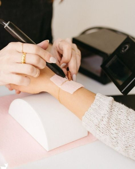 Wenn du zum Termin kommst hast du genügend Zeit zwischen all den schönen Ketten deinen Favoriten auszuwählen wie auch etwaige Verbindungs-Elemente oder Anhänger. Wenn du alles ausgewählt hast werde ich das Kettchen genau abmessen so wie es dir wohl ist. Hier ist es ganz unterschiedlich, einige mögen die Kettchen lieber anliegend andere haben gerne etwas spiel. Du entscheidest! Sobald die richtige Länge etc. bestimmt ist werde ich die Kette um dein Hand- oder Fussgelenk legen und die beiden Kettenenden mit einem kleinen Ring miteinander verbinden. Anschliessend bitte ich dich eine spezielle Brille anzuziehen, damit deine Augen von dem "Blitz" geschützt sind. Auch werde ich deine Haut abdecken und schützen. Keine Angst es wird dir nichts passieren und auch nicht weh tun. Wenn ich soweit bin werde ich die Naht vom Ring mit dem Schweissgerät schweissen. Hierbei entsteht ein Mini-Funke und das ganze dauert nur wenige Sekunden und schon ist dein Kettchen fertig.