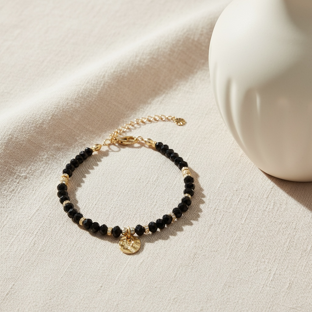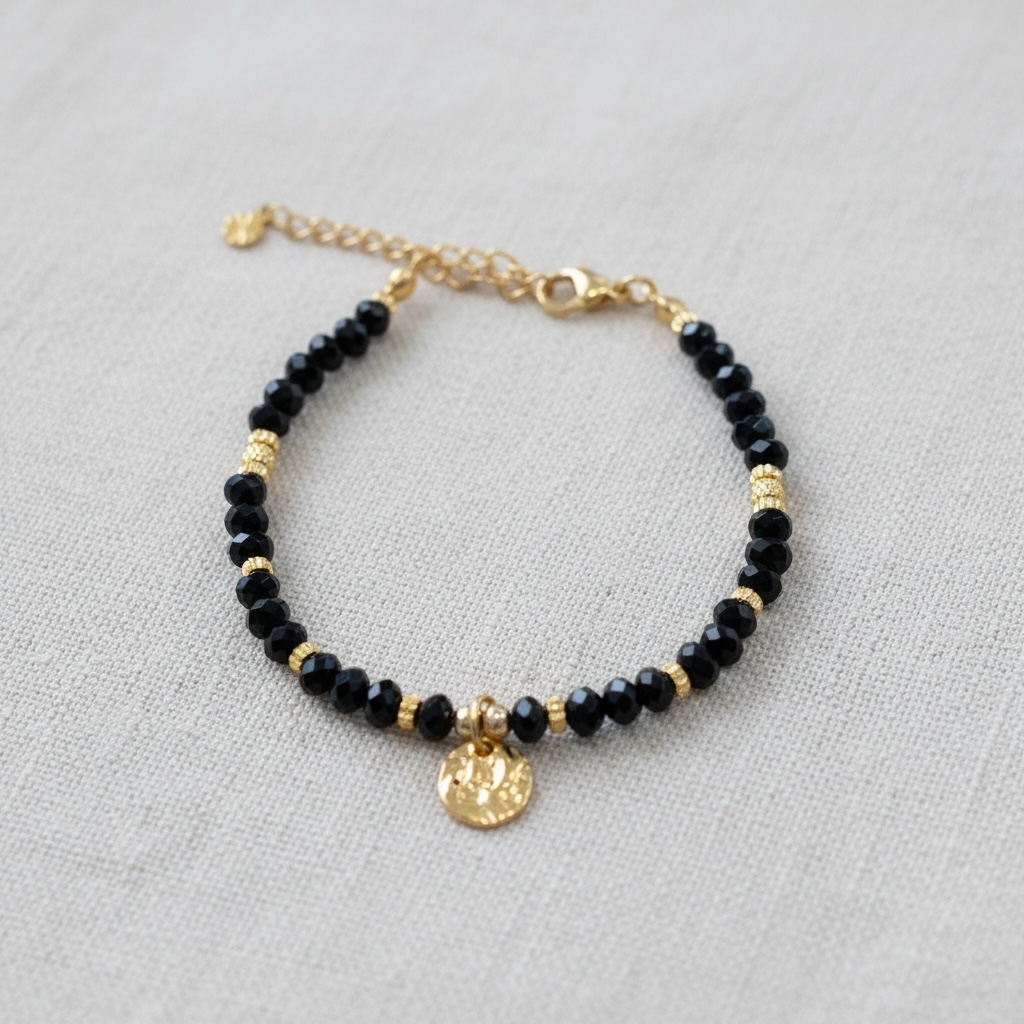 Pure Magie die du am Arm trägst. Diese Armkette handgefertigt aus geschliffenem Onyx wirkt elegant und magisch. Kombiniert mit goldenen Elementen aus Edelstahl.