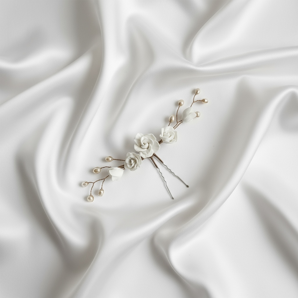 Haarpin bestehend aus 5 handgefertigten Rosenblüten weiss aus Polymer-Clay. Ergänzt mit wunderschönen Perlen auf Draht gewickelt. Blütenfarbe kann auf das Brautkleid und Brautstrauss abgestimmt werden. Kann mit Gold- oder Silberdraht angefertigt werden. Anfertigungszeit ca. 2-3 Wochen.