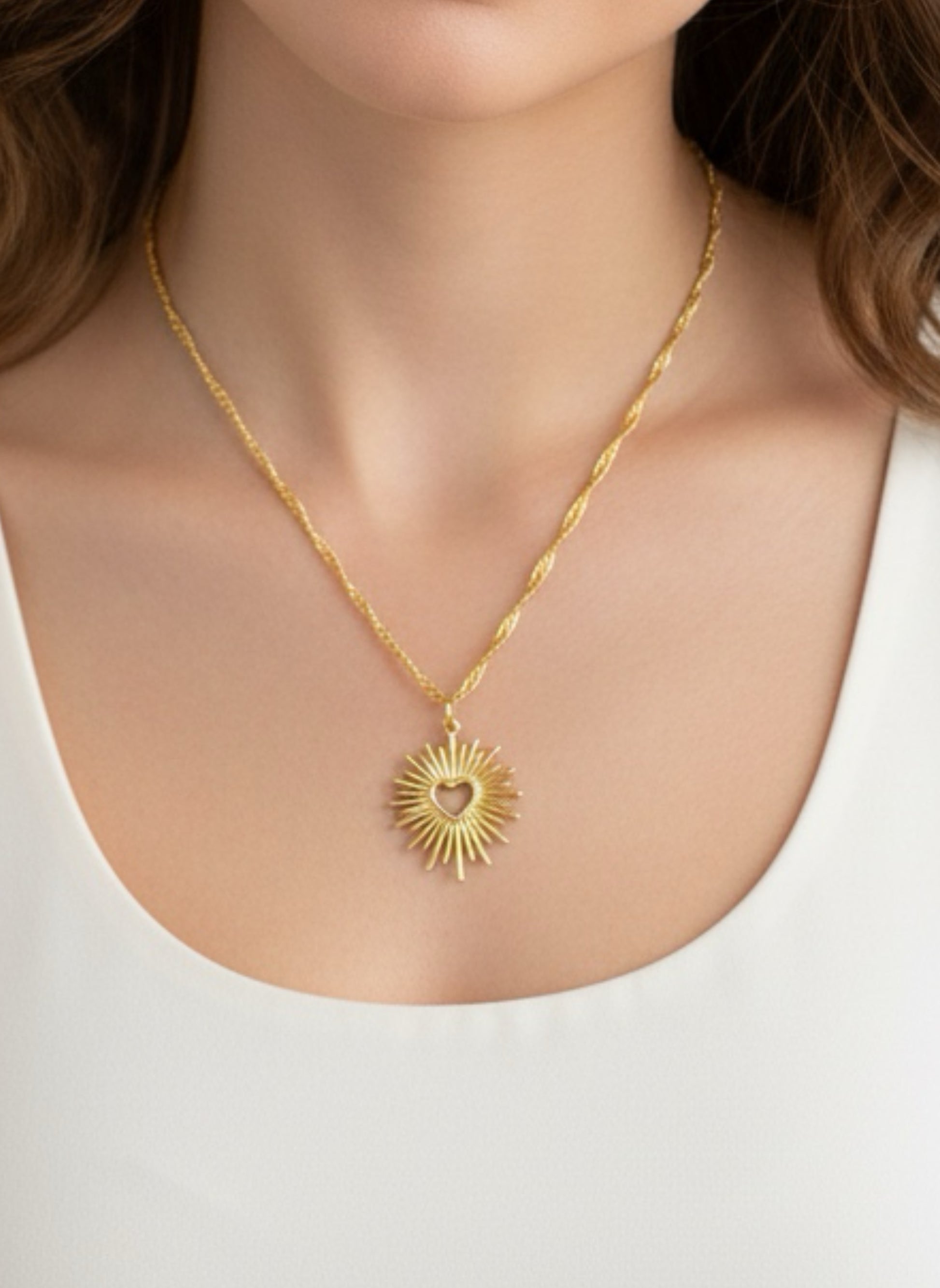 Die Halskette Sunheart vereint das Symbol der Sonne mit einem zarten Herz im Zentrum. Ein Schmuckstück, das nicht nur glänzt, sondern auch eine Botschaft trägt: Wärme, Liebe und positive Energie. Gefertigt aus hochwertigem, vergoldetem Edelstahl, ist die Kette langlebig, wasserfest und hautfreundlich – perfekt für den Alltag und besondere Momente.