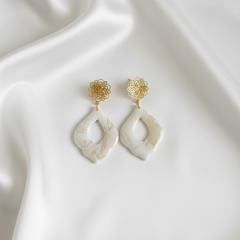Ohrring creme-weiss mit Blattgold. Anhänger aus Polymer-Ton. Ohrstecker aus Stainless Steel. ULTRALIGHT!