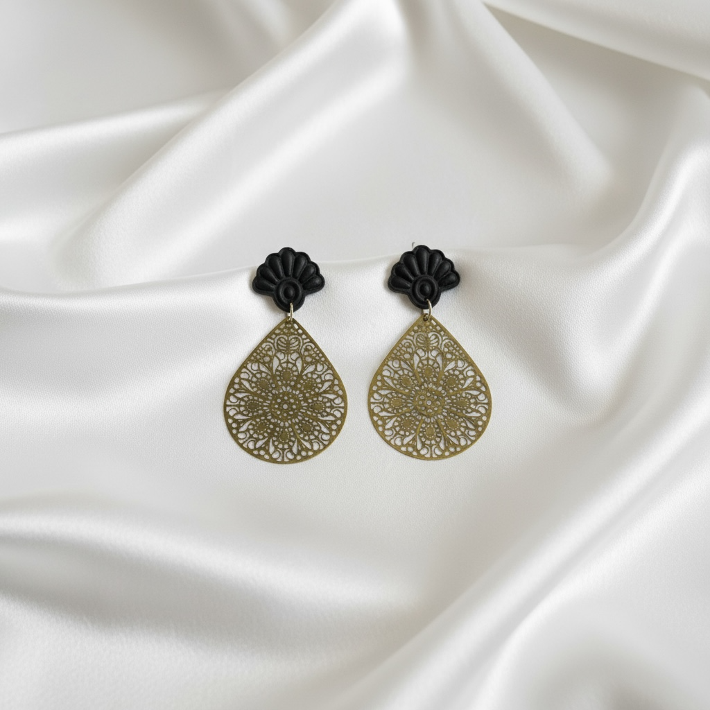 Ohrring gold-schwarz. Der obere Teil besteht aus Polymer-Ton. Der Anhänger aus Edelstahl 18k vergoldet. Ohrstecker aus hautverträglichem Edelstahl. ULTRALIGHT!