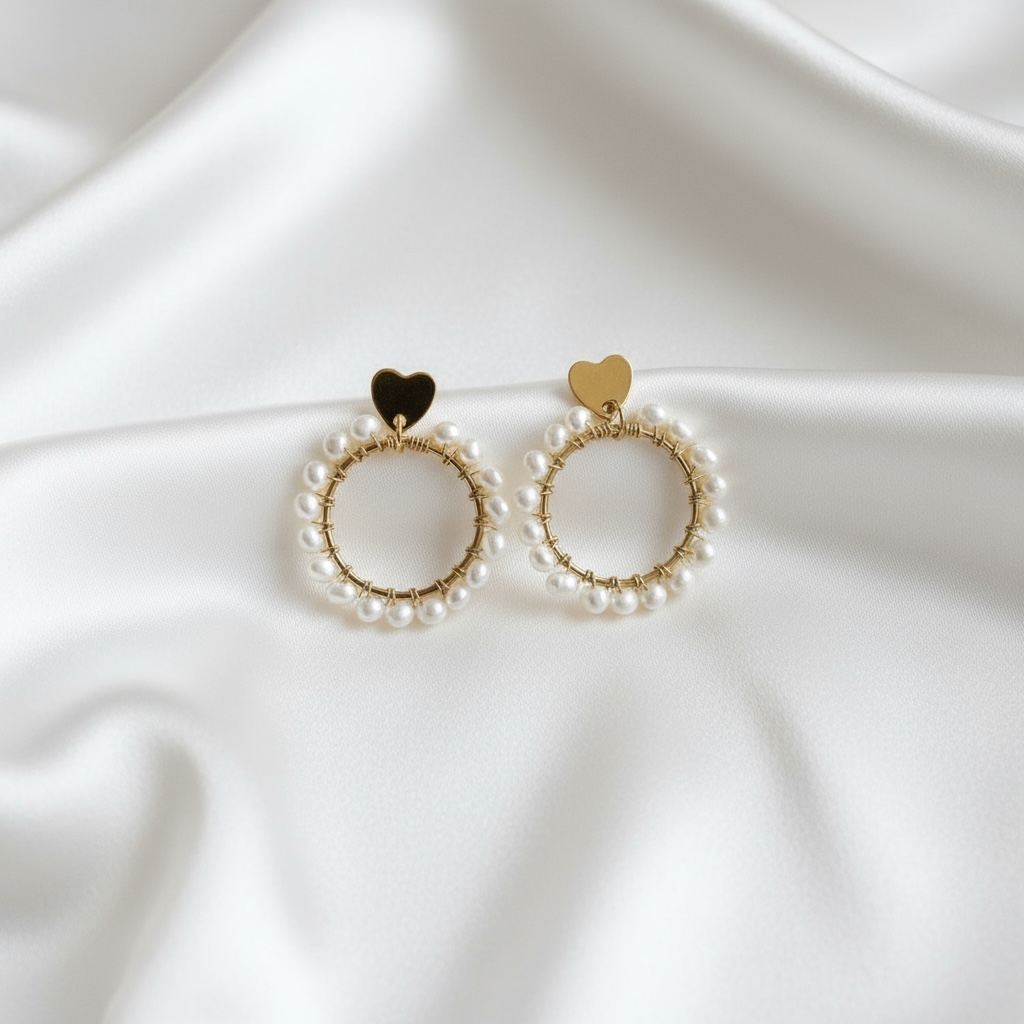 Ohrring mit Süsswasserperlen auf Draht gewickelt. Herzohrstecker aus Edelstahl 18k vergoldet.
