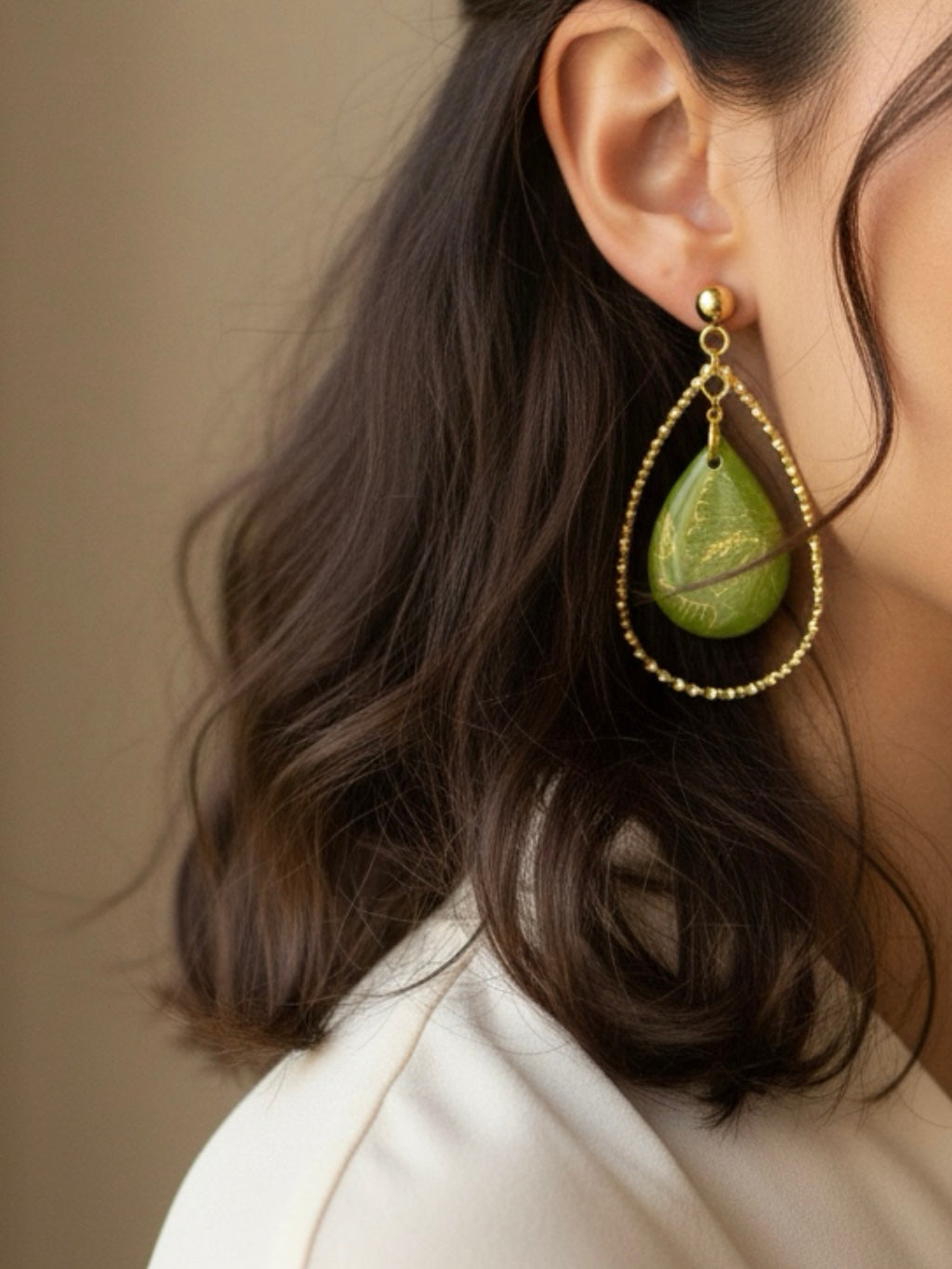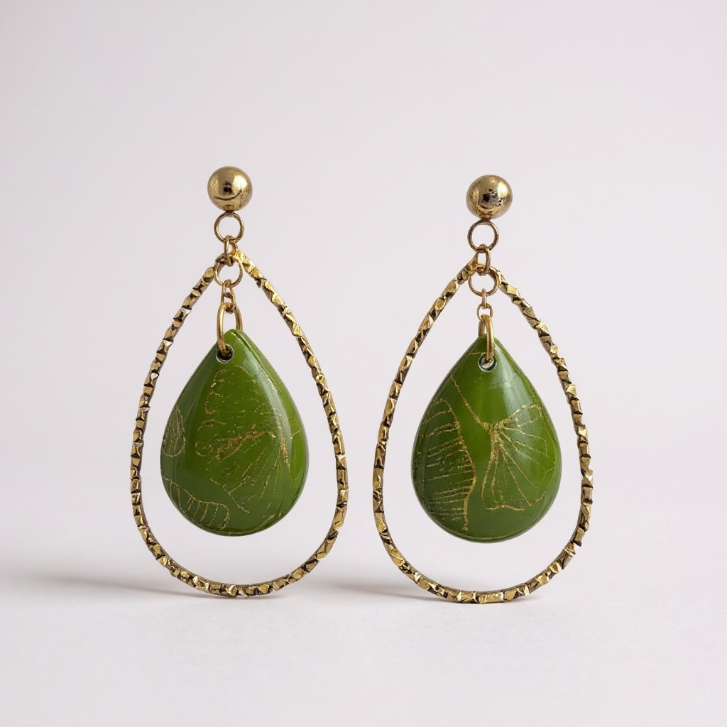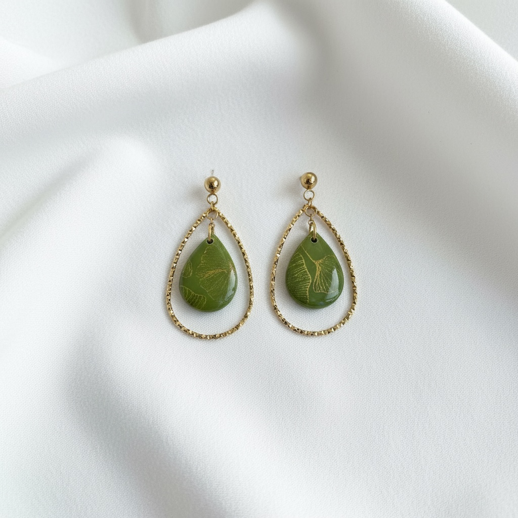 Die Tropfenform aus hochwertigem Polymer Clay ist mit einem zarten Blattmuster versehen. Das Zusammenspiel von Naturmotiven und edlem Gold verleiht den Ohrringen eine zeitlose, elegante Ausstrahlung.