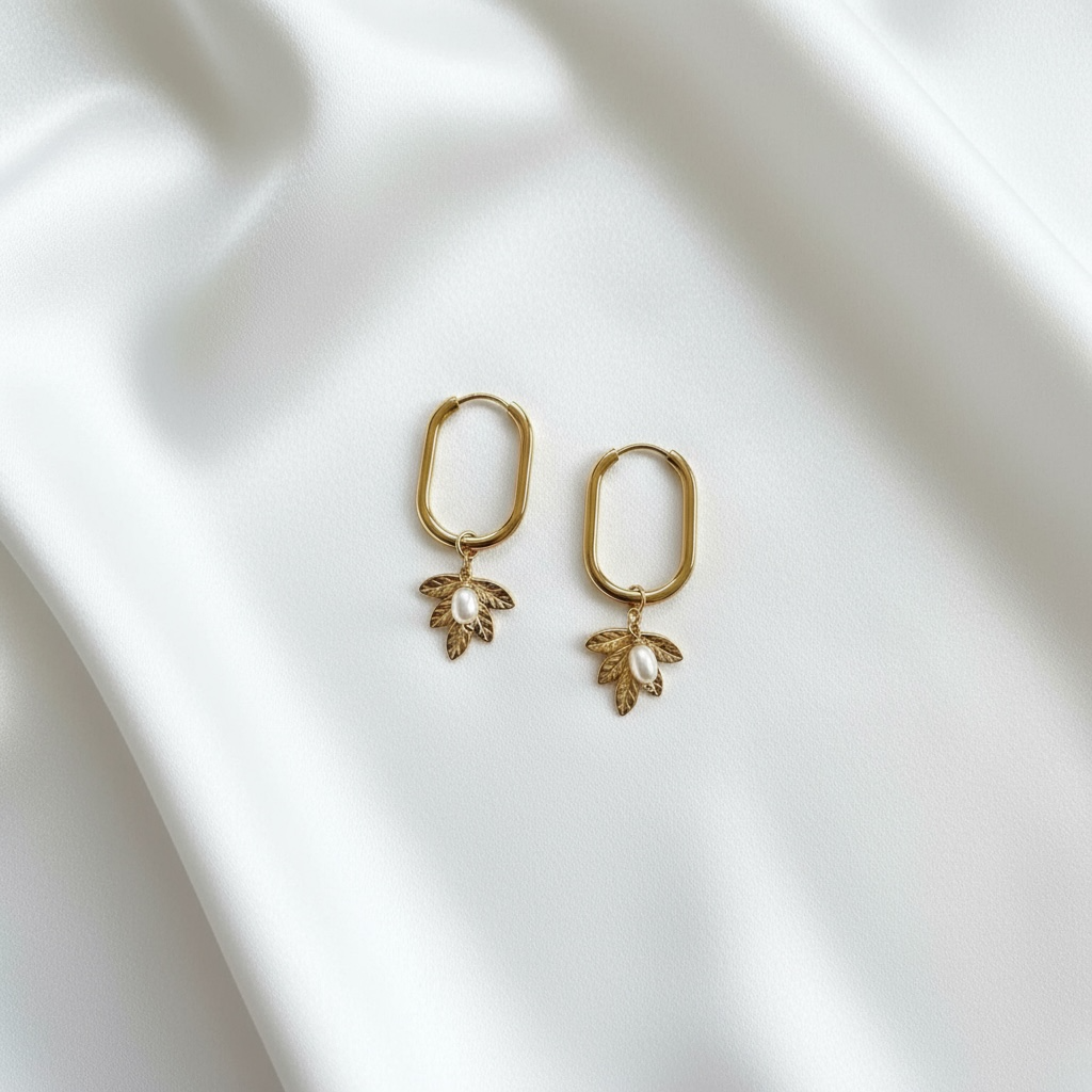 Diese handgefertigten Ohrringe kombinieren goldene Blätter mit einer zarten Perle – ein harmonisches Spiel aus Naturinspiration und stilvoller Leichtigkeit.