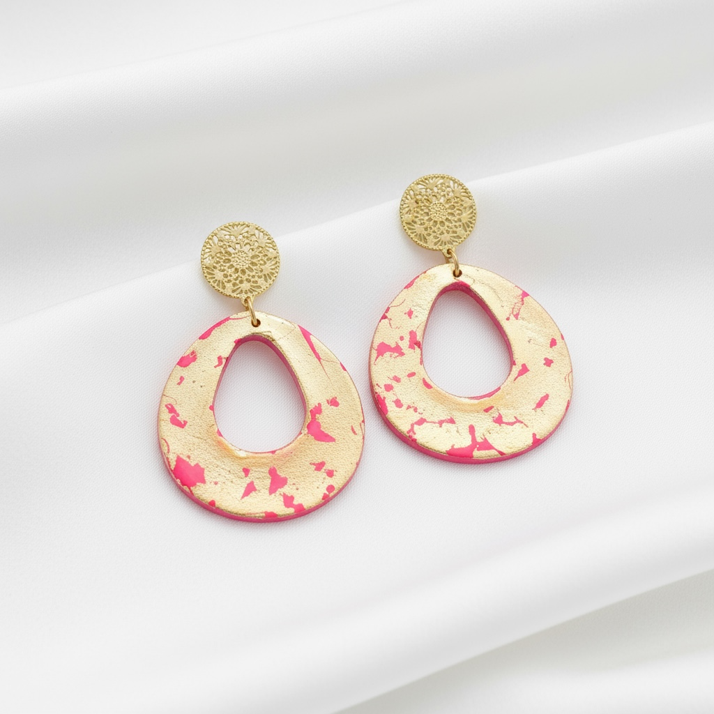 Ohrring aus Polymer-Ton himbeer-farben überzogen mit echtem Blattgold. Ohrstecker aus rostfreiem Edelstahl. ULTRALIGHT!