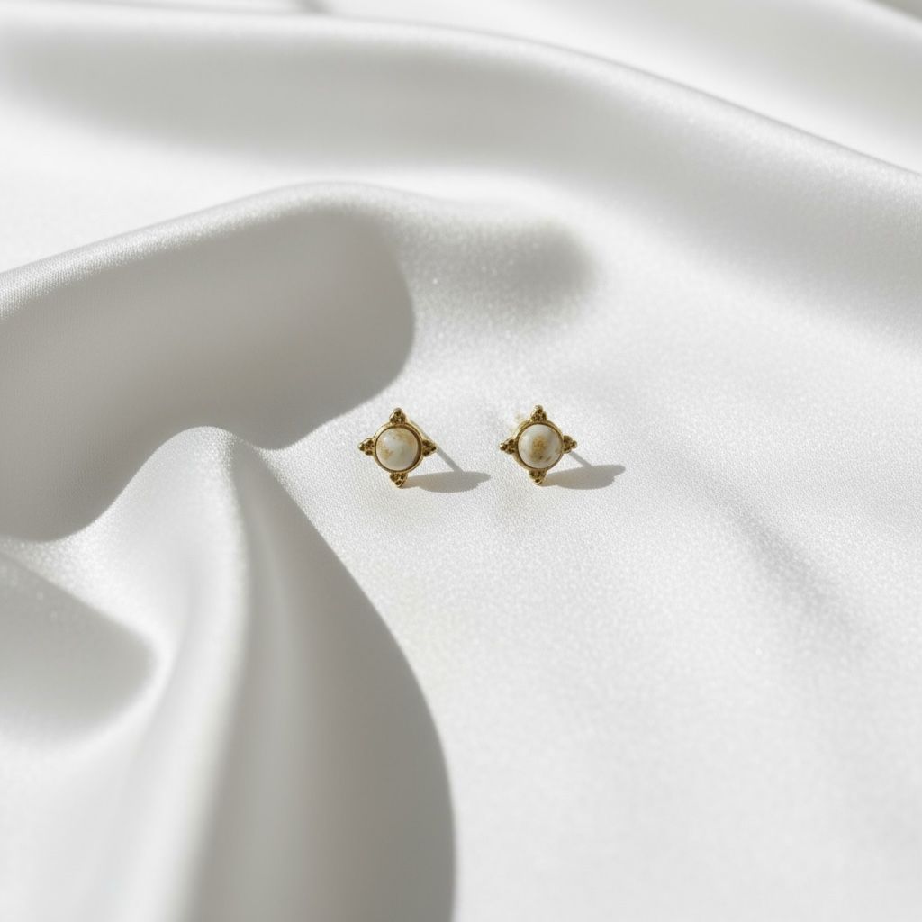 Süsser Mini-Ohrstecker aus Edelstahl 18 Karat vergoldet. "Stein" aus Polymer Ton weiss-creme mit echtem Blattgold. Jedes Stück ein Unikat und ein echter Hingucker.