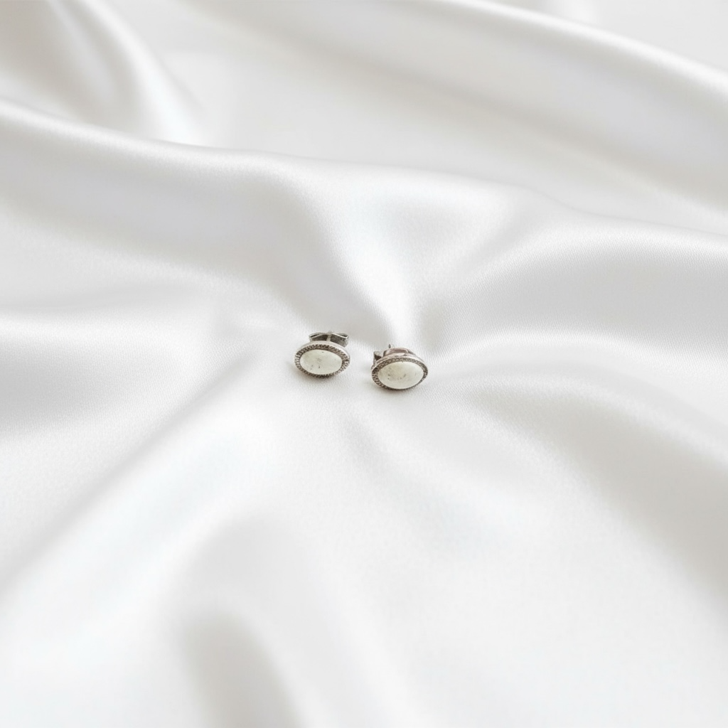 Edler Mini-Ohrstecker aus Edelstahl. "Stein" aus Polymer Ton weiss-creme mit echtem Blattsilber. Jedes Stück ein Unikat.