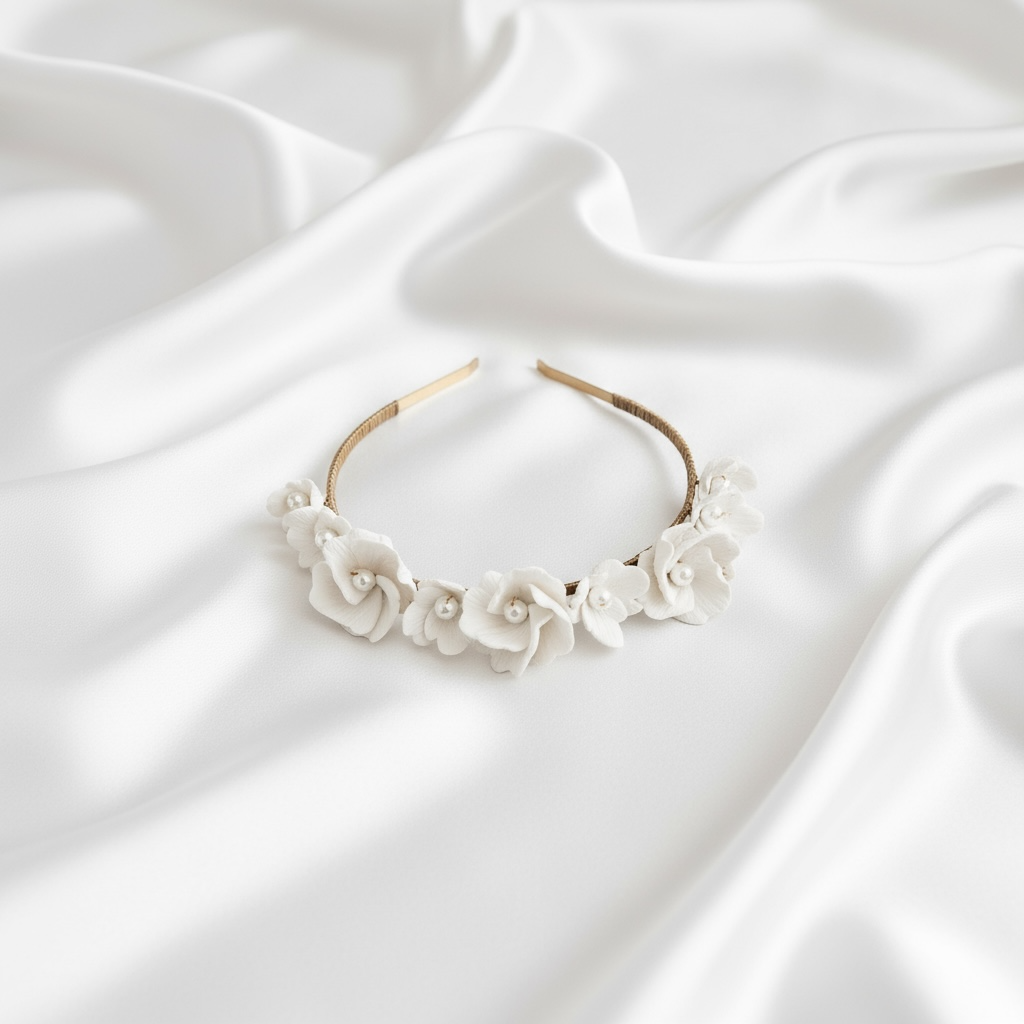 Handgemachte Tiara mit Blüten aus Polymer Ton und echten Perlen besetzt.